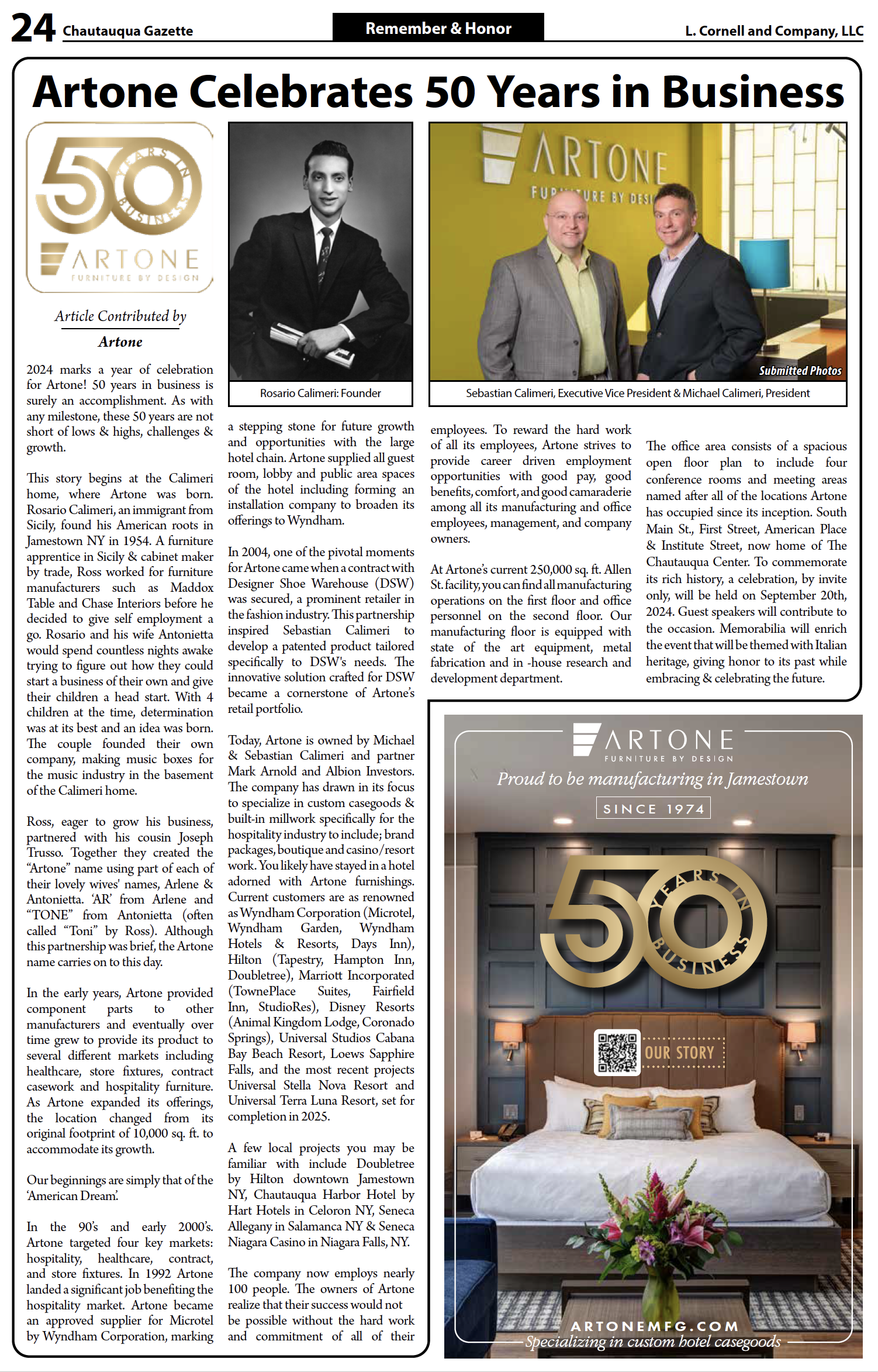In 2014, the owners of Artone strategically relocated to a much larger facility in Jamestown's industrial corridor. This was a significant step forward in the growth journey for Artone. This move did not only signify expansion but a commitment to better serve its customers . The new space offered ample room for increased production capacity, enhanced operational efficiency, and positioned Artone to embark on a new chapter of success!